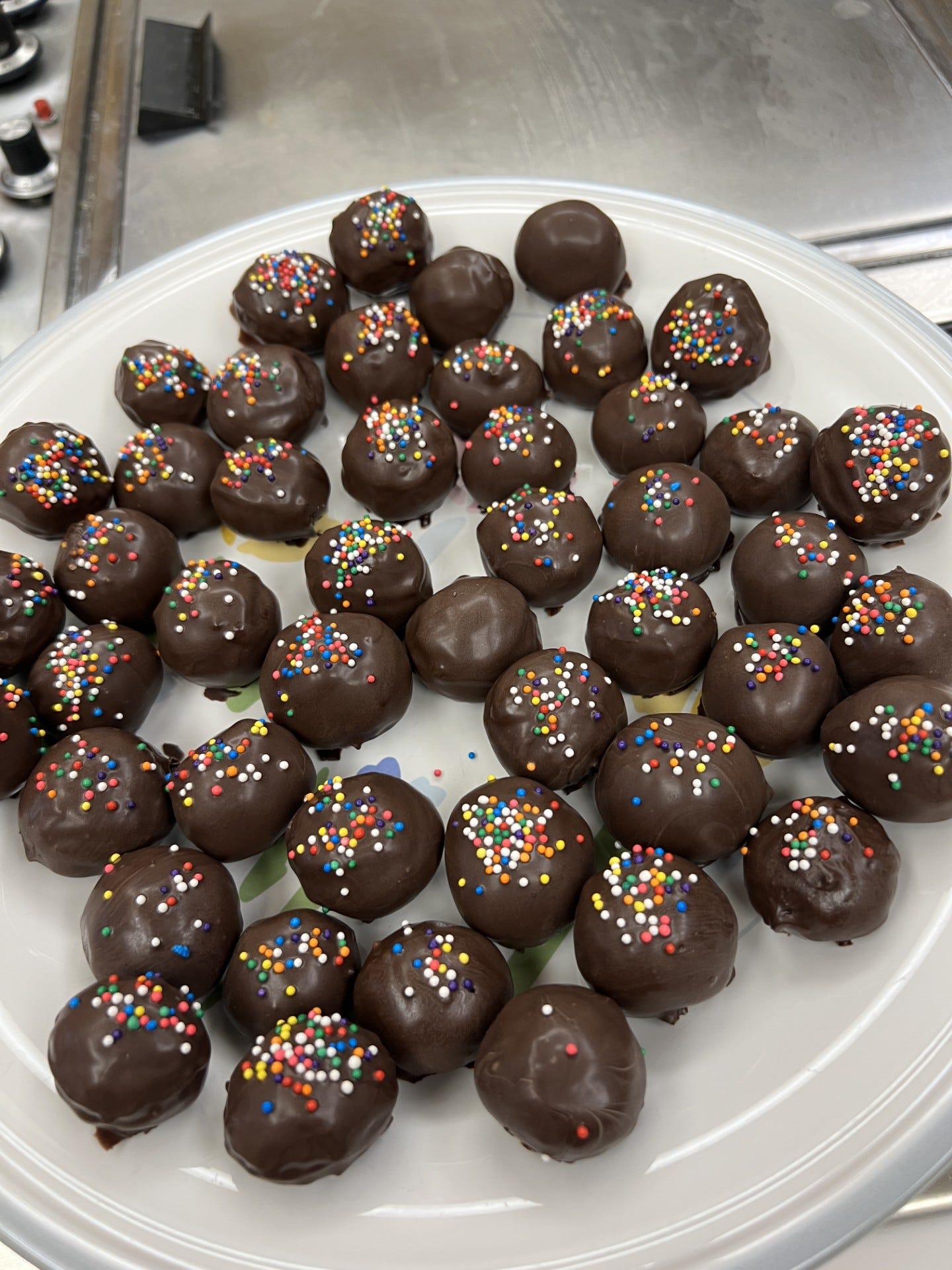 Optional Garnishes: While the coated Oreo balls are still wet after dipping you can use any cake-decorating candies for garnish. (I used the mini multi-colored dots and tabs). Sprinkle the Oreo balls while on the sheet drying.