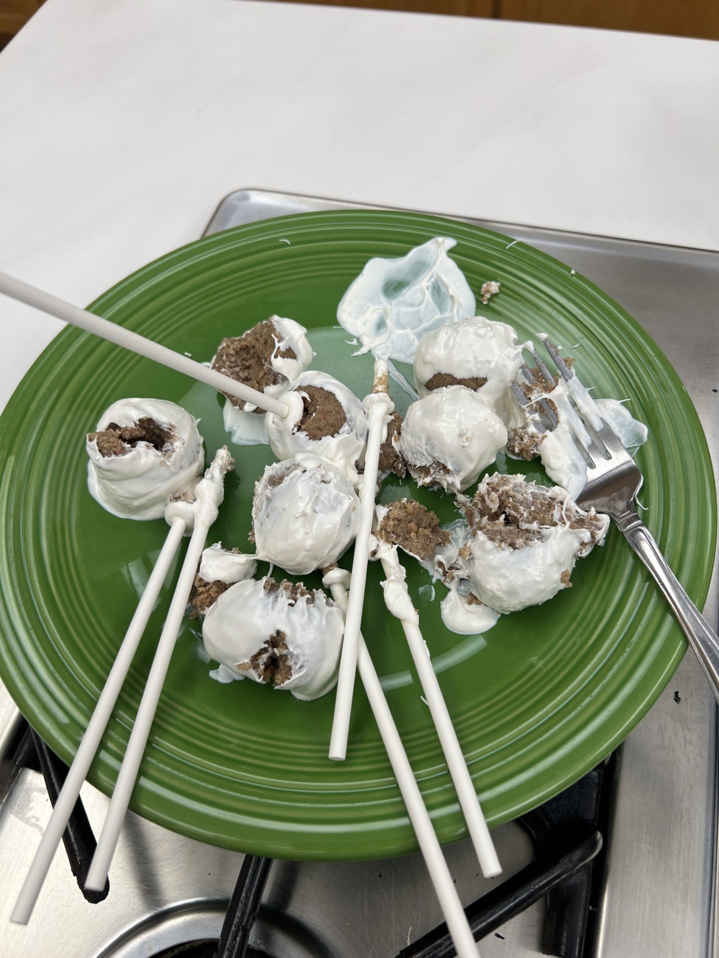 Clearly not acceptable. As you can see, the cake balls refused to stay on their sticks. No matter what I did, they’d slide, crumble, or just flat-out rebel. I tried every which way to get them to adhere but no luck. Well, they weren’t acceptable for company perhaps, but they tasted good to us! We ate them with forks and enjoyed every last crumb. No career for me in cake pops.