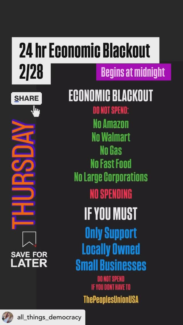 TOMORROW, ONE DAY ONLYDo It While You Can!Stevie WeinbergFeb 27, 202511ShareIt WILL make a difference. We WILL be noticed. Democrats and Republicans, we need to show our strength. Our strength is always in our spending.